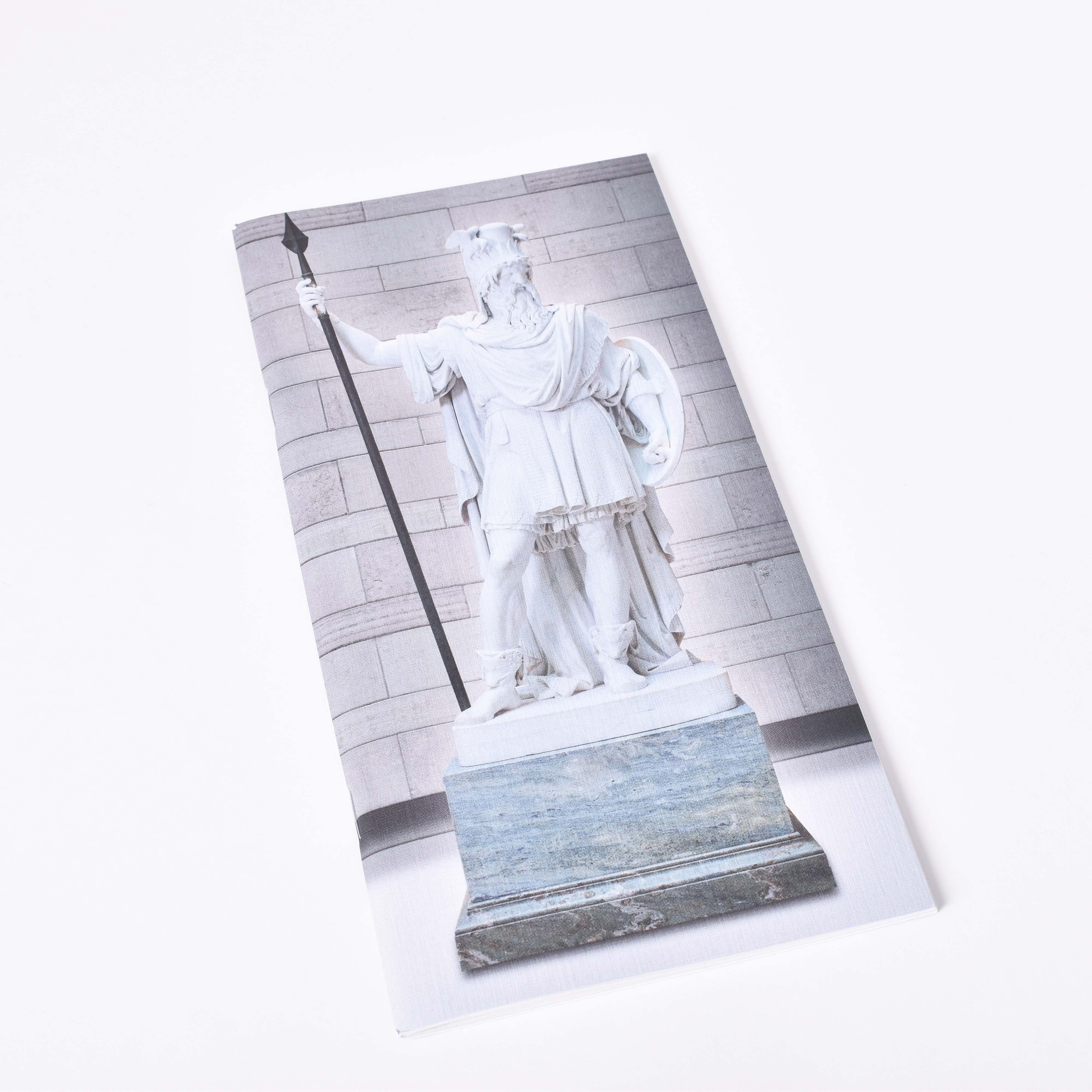 Set med 3 Anteckningshäften i långsmalt format med motiv av de fornnordiska gudarna Tor, Oden och Balder. Skulpturerna av Carraramarmor kan ses i original i Skulpturgården på Nationalmuseum.