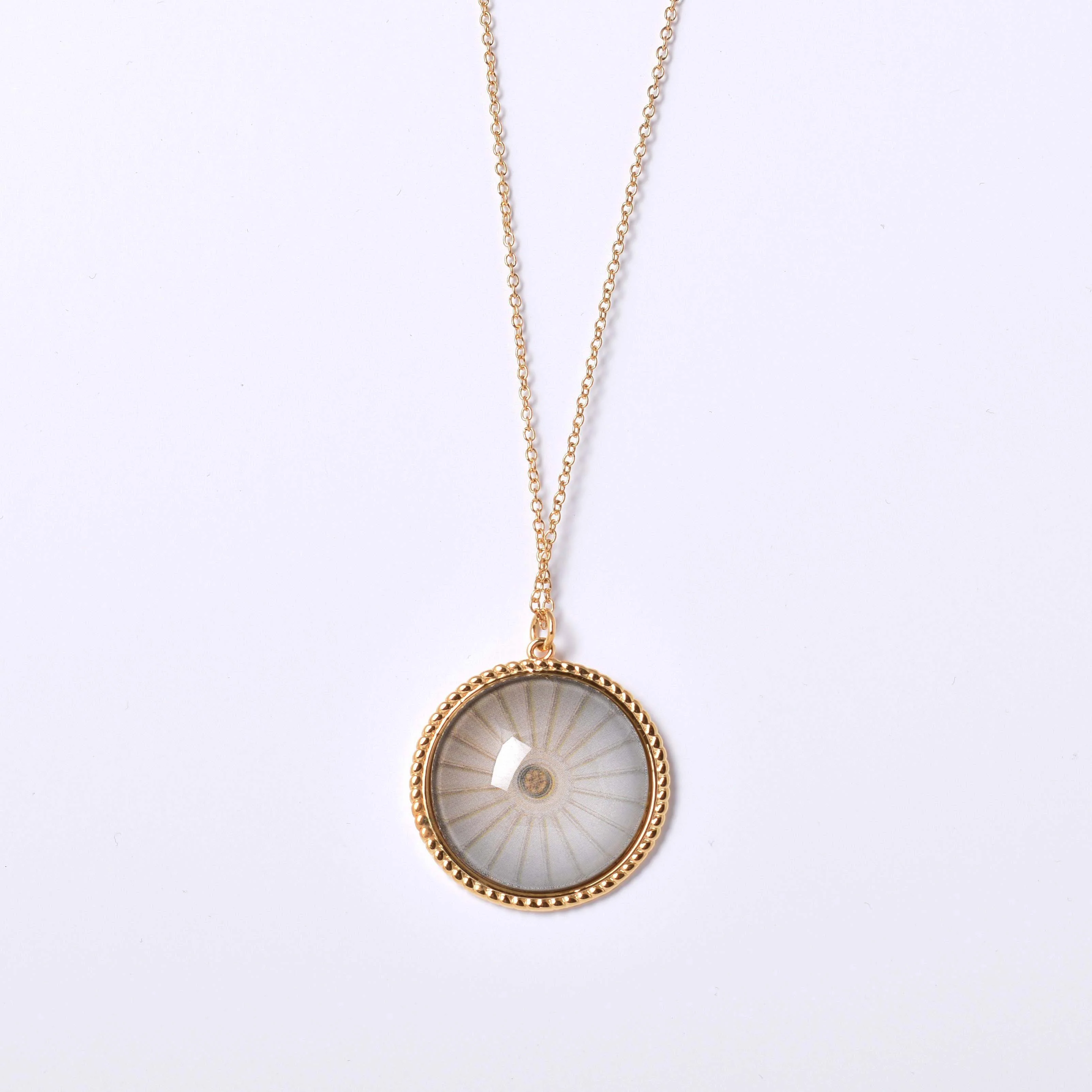 PÄ Nationalmuseum finns 349 takrosetter i tio olika varianter. En rund berlock med motivet av en takrosett i en lÄng kedja av guldplÀterad mÀssing. VÀlj din favorit bland tre olika motiv.