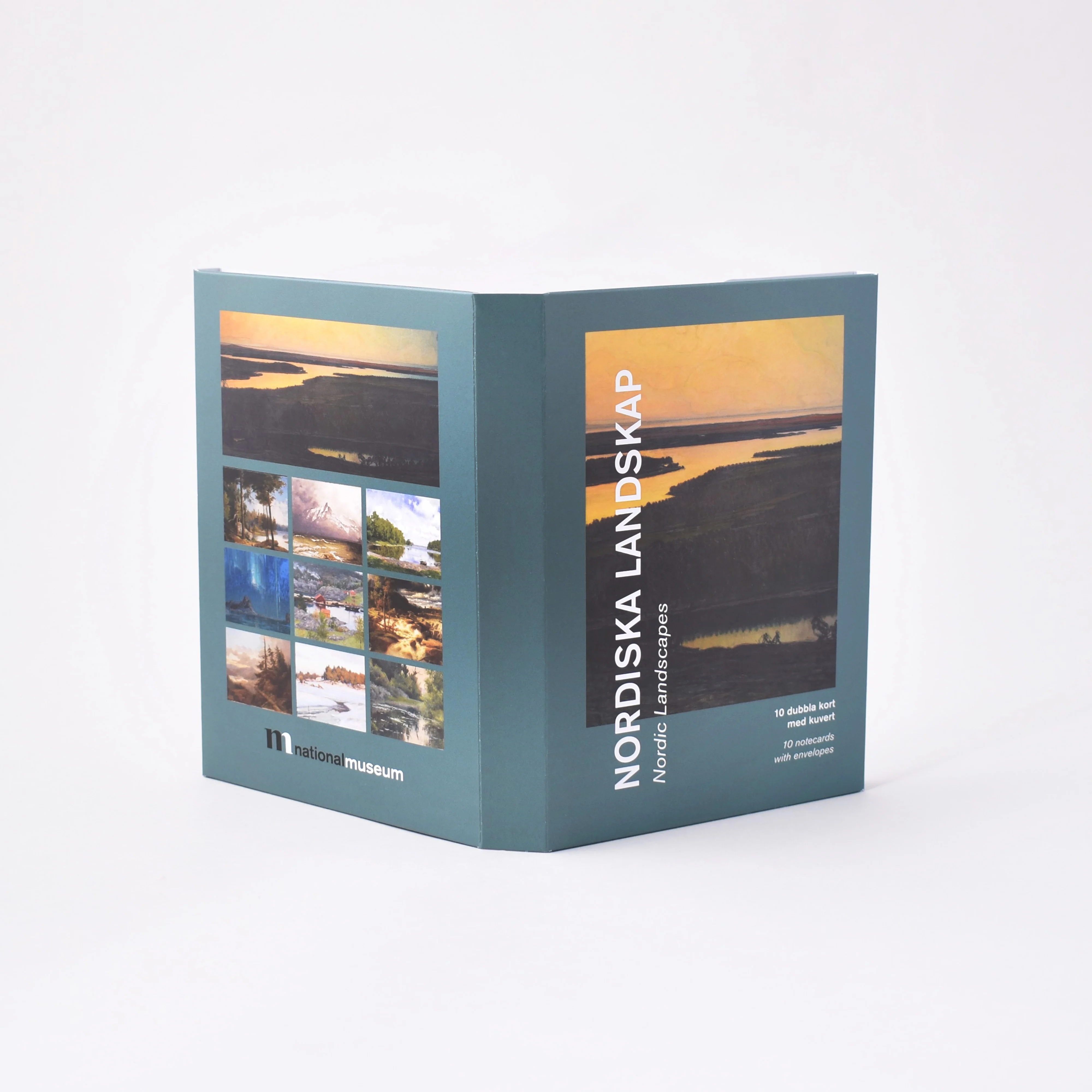 Snygg mapp med tio dubbla kort och kuvert. Vykortens motiv Àr hÀmtade frÄn tio vackra landskapsmÄlningar med nordiska landskap frÄn Nationalmuseums samlingar.