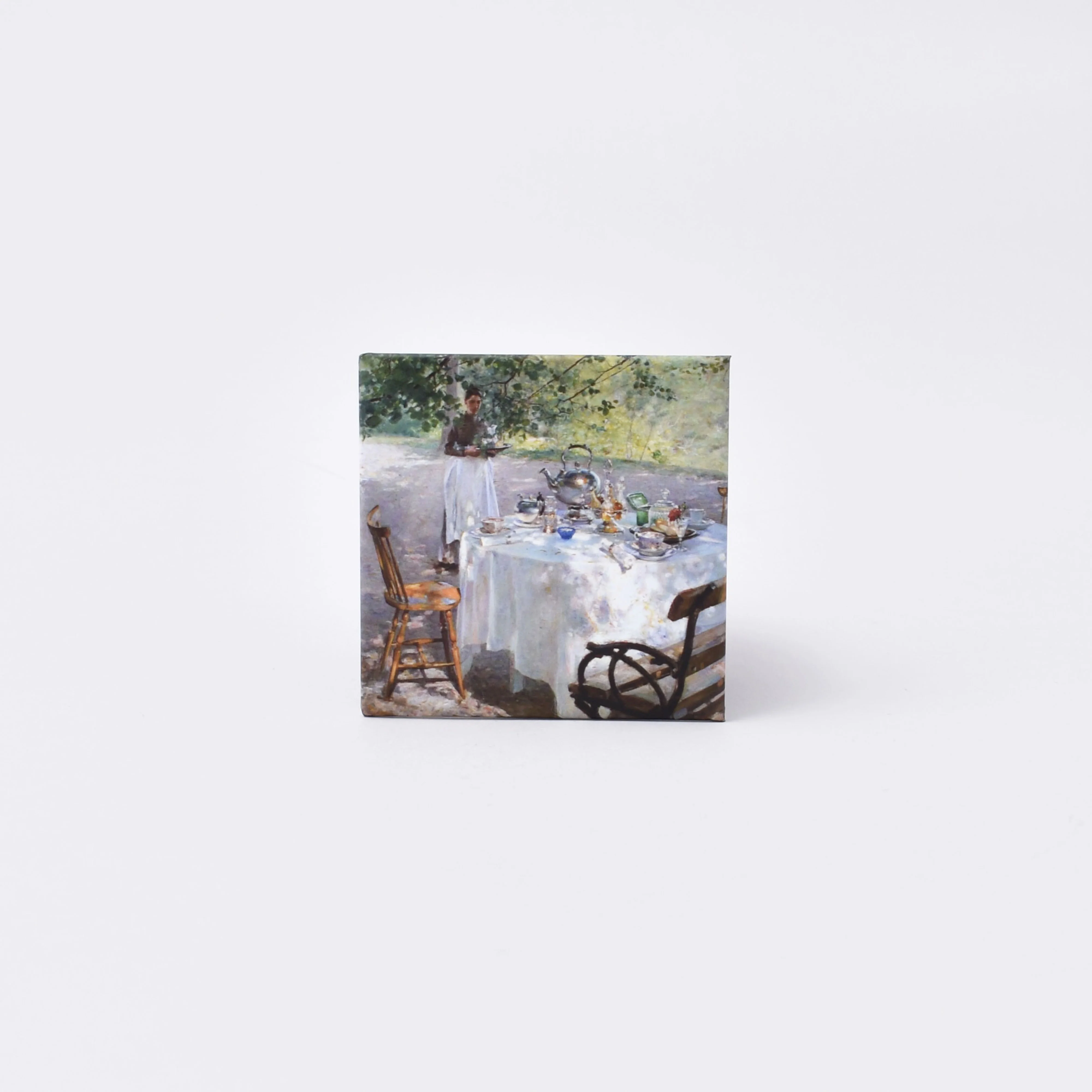 Kvadratisk magnet med motivet Frukostdags av konstnÀren Hanna Pauli frÄn Nationalmuseums samlingar.
