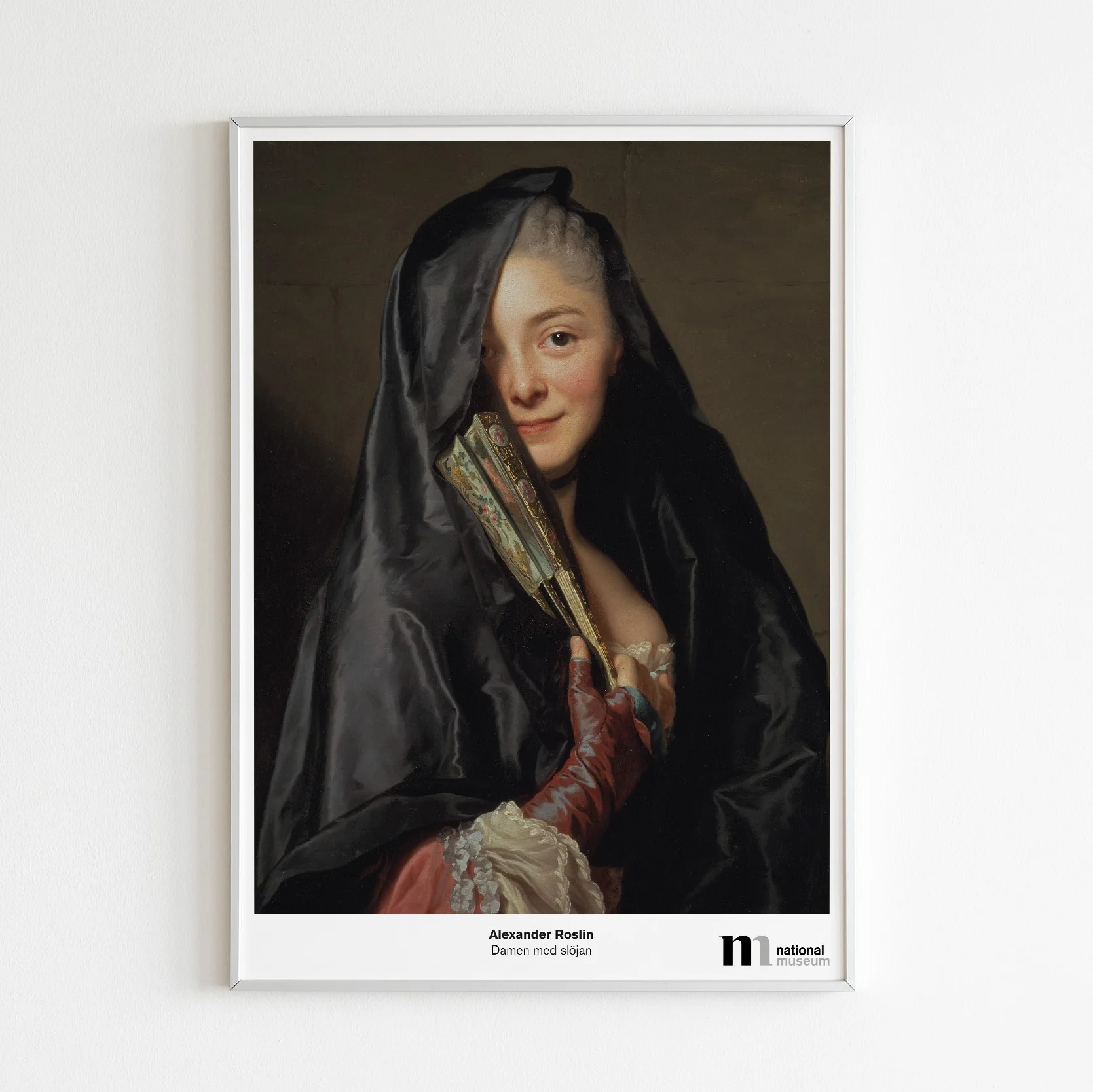 Poster med ett av Nationalmuseums mest populĂ€ra verk Damen med slöjan mĂ„lat av konstnĂ€ren Alexander Roslin.Â